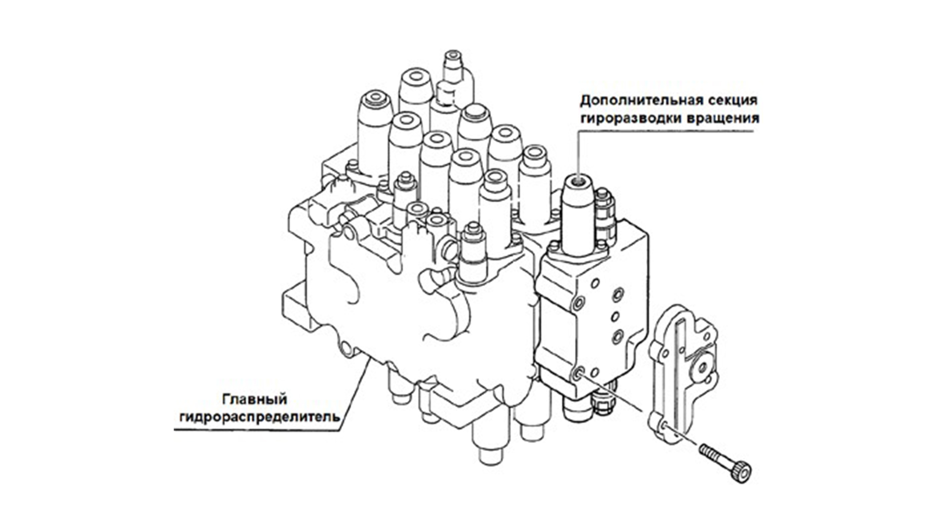 Гидроразводка вращения — специализированная гидролиния, обеспечивающая поворот навесного оборудования и аналогичные операции. Учитывая потребности парка техники, мы разработали систему с заводским конструктивом, который ранее применялся в экскаваторах японского производства. Ключевая особенность решения — использование дополнительной секции распределителя, совместимой с гидросистемой базовой машины.
