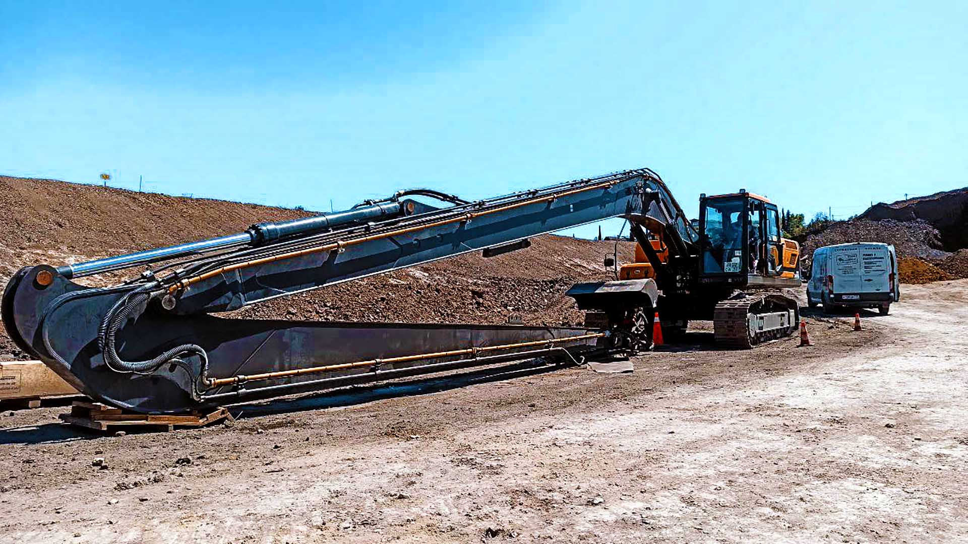 Формирование таких насыпей на объекте будет осуществляться с помощью гусеничного экскаватора, оборудованного удлинённым рабочим оборудованием с тилтротатором и планировочным ковшом. Подобранный комплект дает возможность выполнять планировочные работы на вылете до 22 метров.
