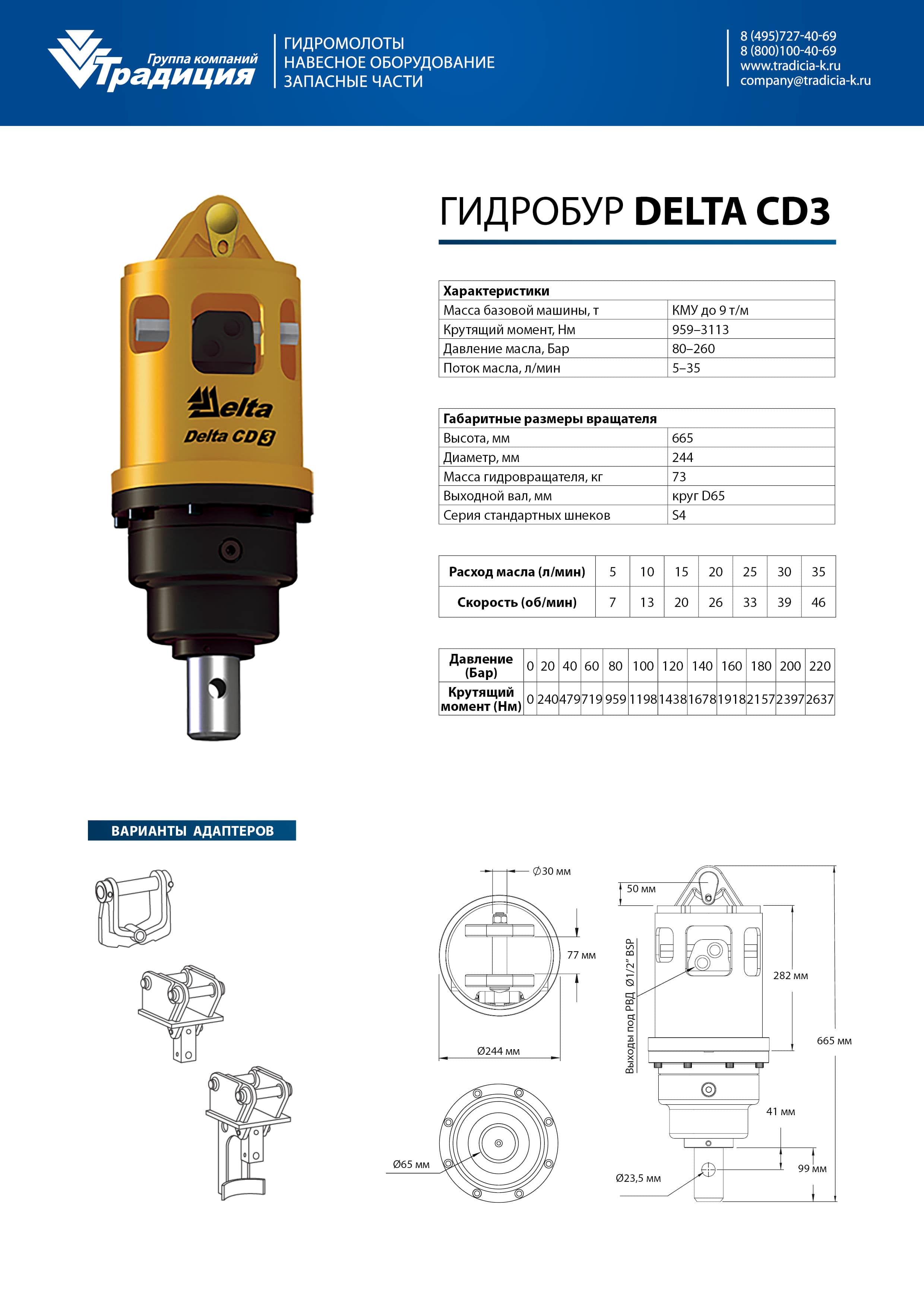 ГК «Традиция» предлагает гидровращатель Delta СD3 со склада в Москве и регионах. Покупая вращатель у нас, вы получаете гарантийную и постгарантийную поддержку оборудования Delta на протяжении всего срока эксплуатации. Редукторы всех гидровращателей Delta имеют увеличенный гарантийный срок, который составляет 60 месяцев.