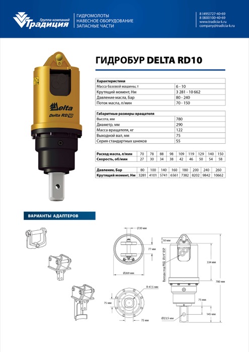 Гидробур на экскаватор 6-10 тонн – это популярный запрос от клиентов, которые бурят скважины диаметром 150-900 мм на глубину 3-7 м и более. В этом случае подойдет гидровращатель Delta RD10.